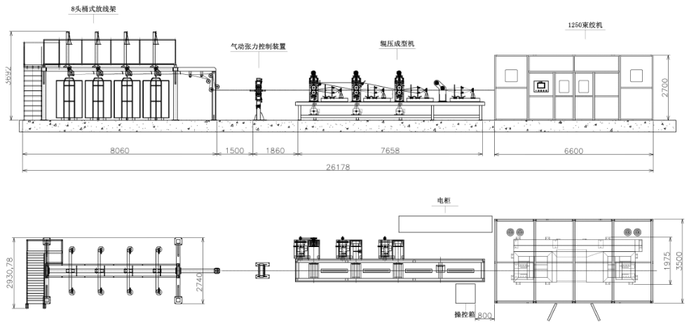 此方案包含一个外部旋转压紧模结构,并提供所需要的牵引力用于压紧导体。导体紧压时,束绞机收线获取,双绞机有一个专门线道减少旋转牵引轮和收线盘 之间的转矩,以致于能保证有一个良好的圆形导体。