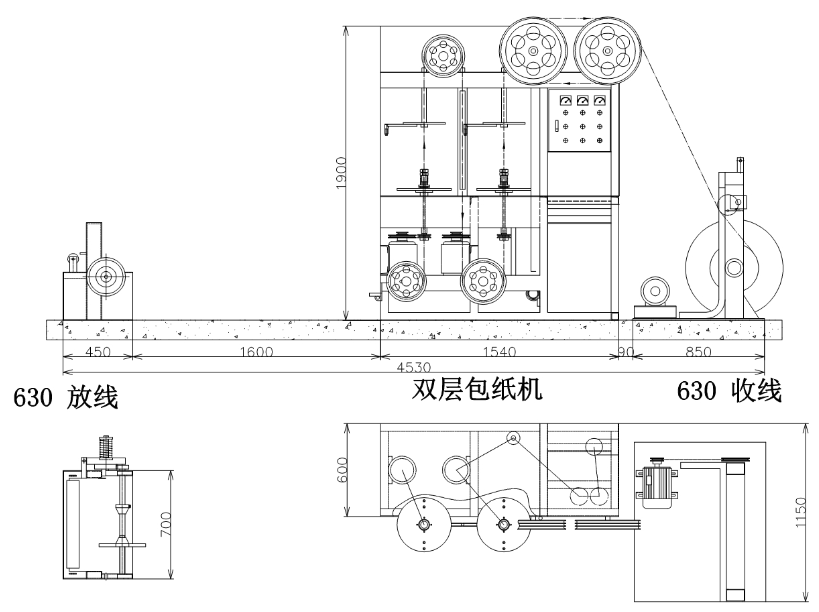 本机为双头绕包,由变频电机经皮带传动,以使绕包盘左右方向旋转,芯线则经引取轮通过二只绕包正反旋转,将绕包带二次绕包在芯线上,以达到二次绕包的目的,通过调整引取轮转速以满足不同绕包节距需要。可按客户要求生产单头、双头、三头包纸机。