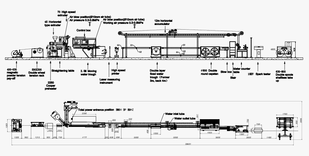 机型 | 导体直径 | 螺杆直径 (mm) | 螺杆长径比 (mm) | 押出量 (kg/hr) | 完成外径 (mm) | 线速度 (M/min) | 马达功率 (KW) |